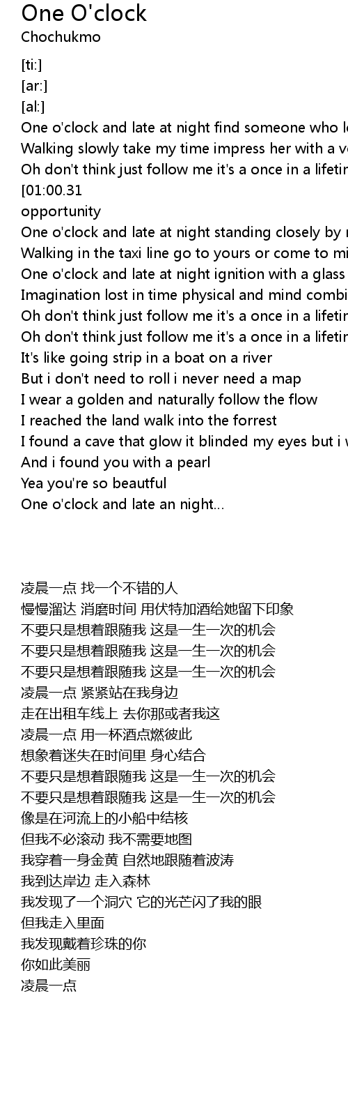 | [01:17.28] | One o' clock and late at night standing closely by my side |