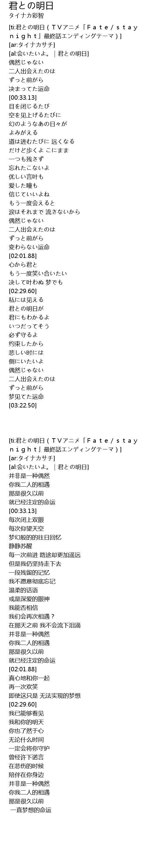 | [ti:君との明日(TVアニメ「Fate/stay night」最終話エンディングテーマ)] | |