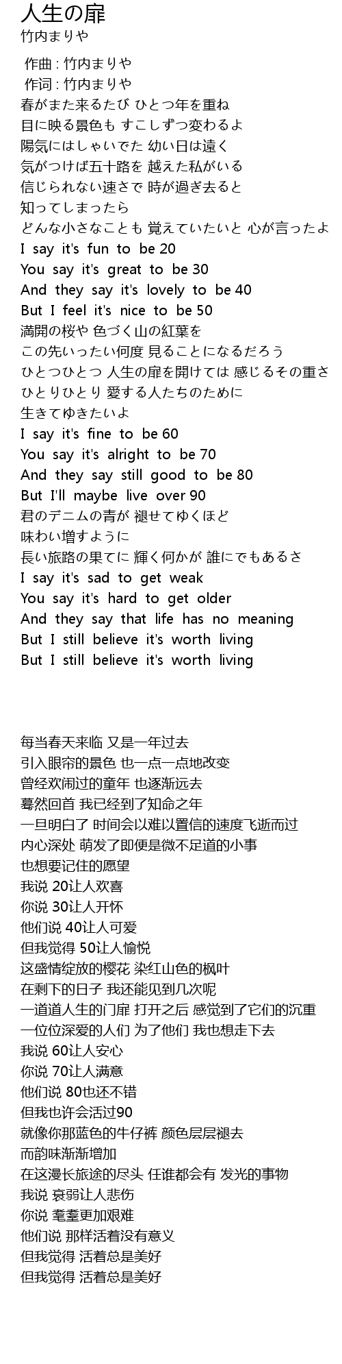 | [03:19.983] | ひとつひとつ 人生の扉を開けては 感じるその重さ |