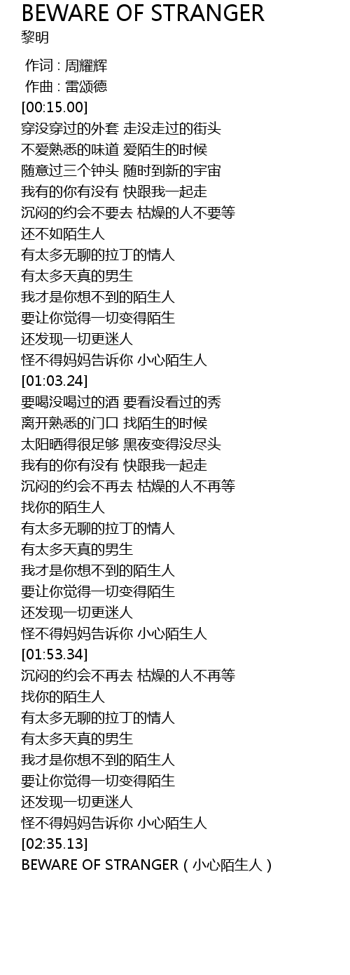 | [02:38.07] | BEWARE OF STRANGER(小心陌生人) |