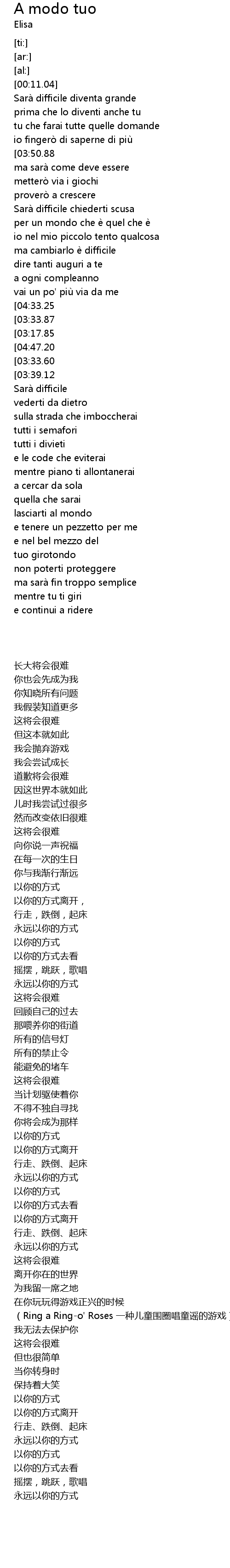 | [04:54.43][04:33.25][03:28.24][03:08.34][02:04.95][01:43.83] | A modo tuo |