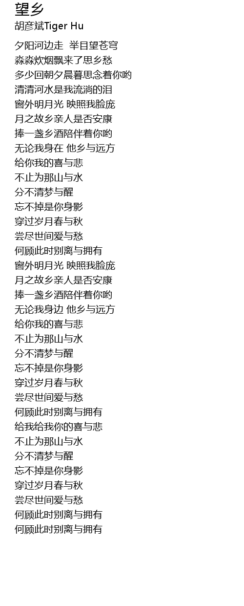 | [00:41.040] | 夕阳河边走 举目望苍穹 |