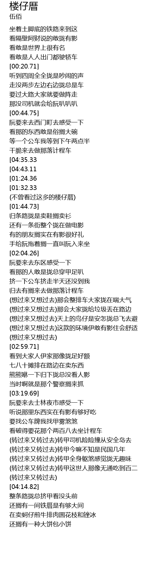 | [04:50.81][01:24.36] | (不曾看过这多的楼仔厝)那会乌麦拢钻来头前搁后壁 |