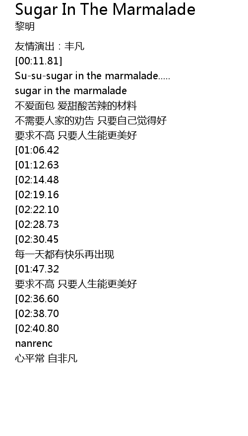 | [03:17.00][02:22.10][01:24.14] | Sugar in the marmalade...... |