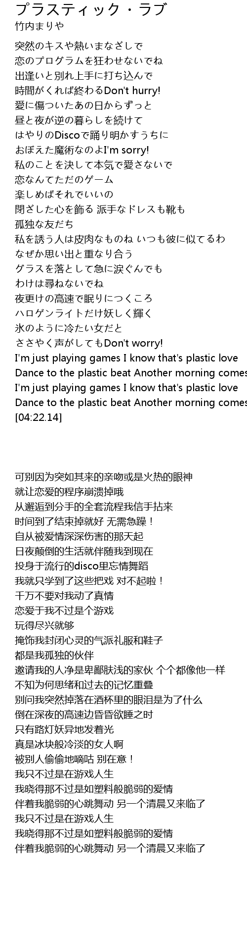 | [03:51.53] | I'm just playing games I know that's plastic love |