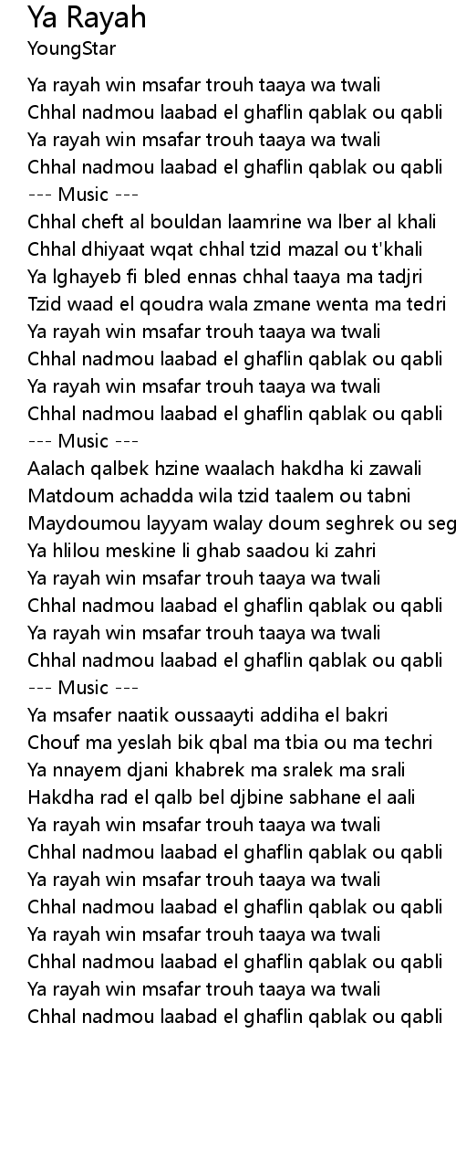 Ya rayah win msafar trouh taaya wa twali |