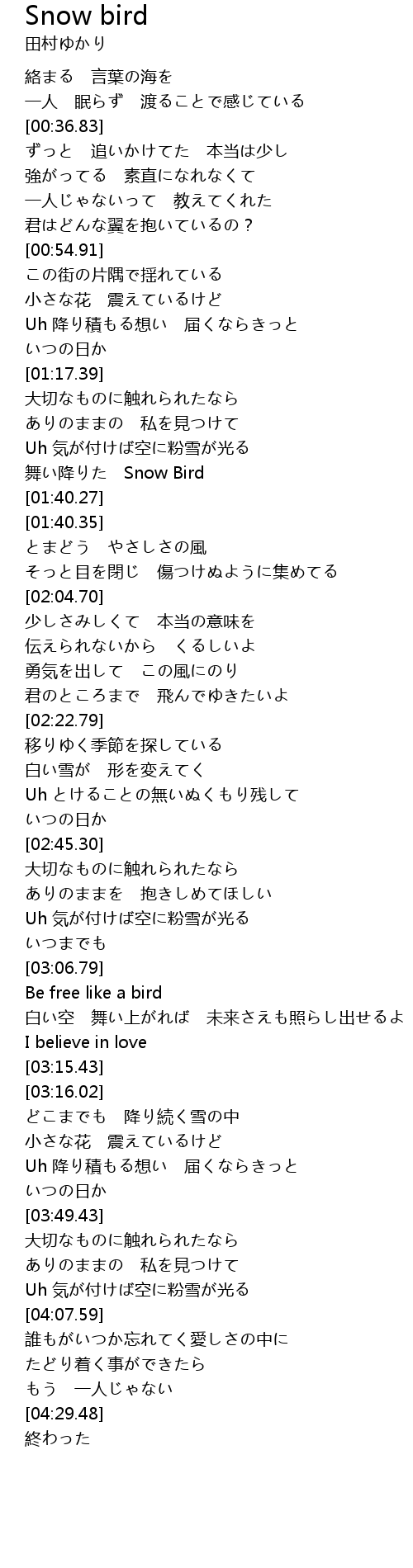 | [01:36.17] | 舞い降りた Snow Bird |