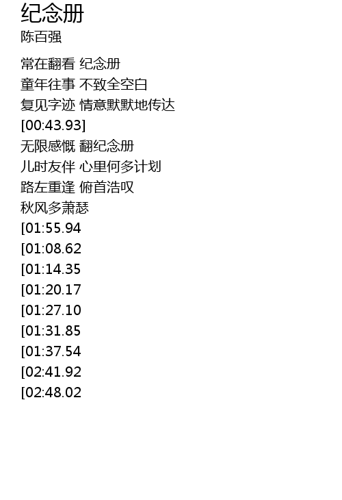 | [02:29.74][01:31.85] | 流泪翻看 纪念册 |