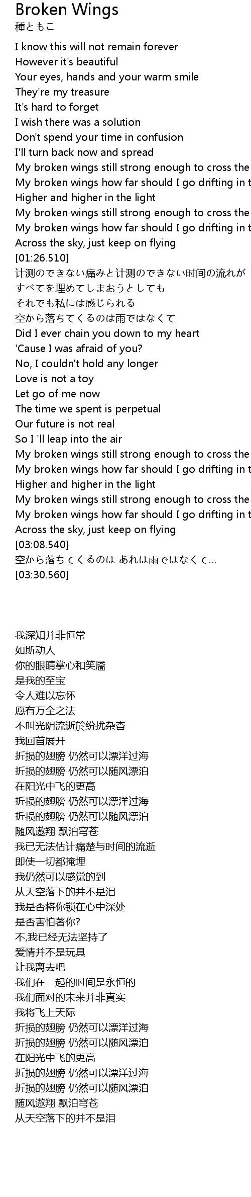 | [02:53.280] | My broken wings how far should I go drifting in the wind |
