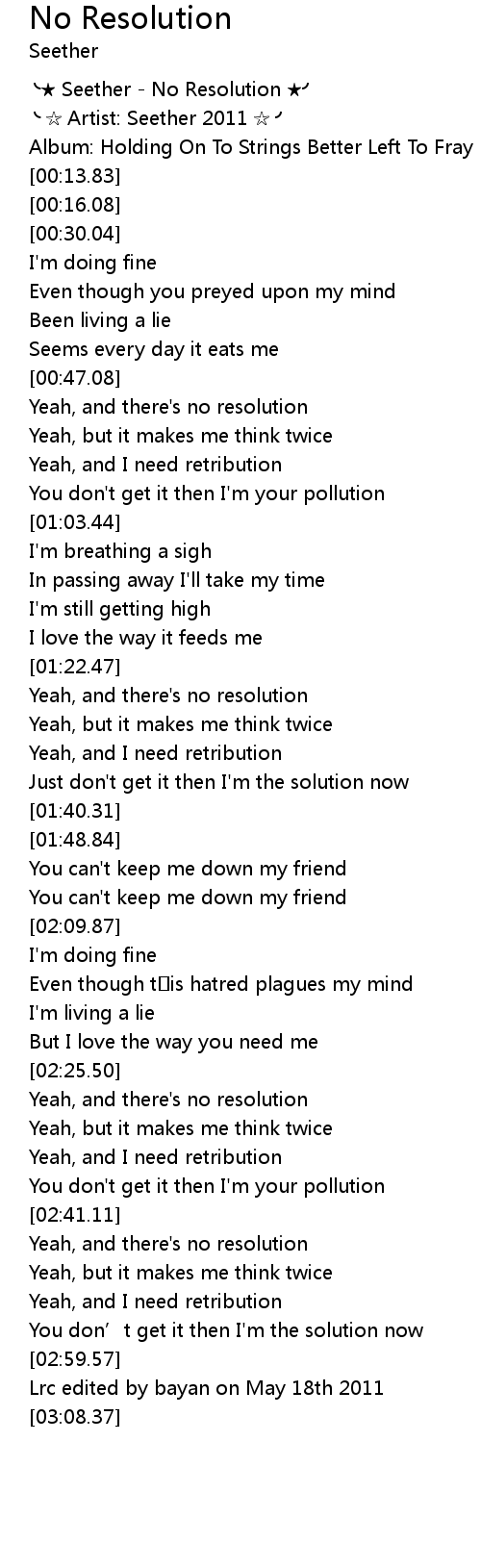 | [00:01.16] | ╰★ Seether - No Resolution ★╯ |