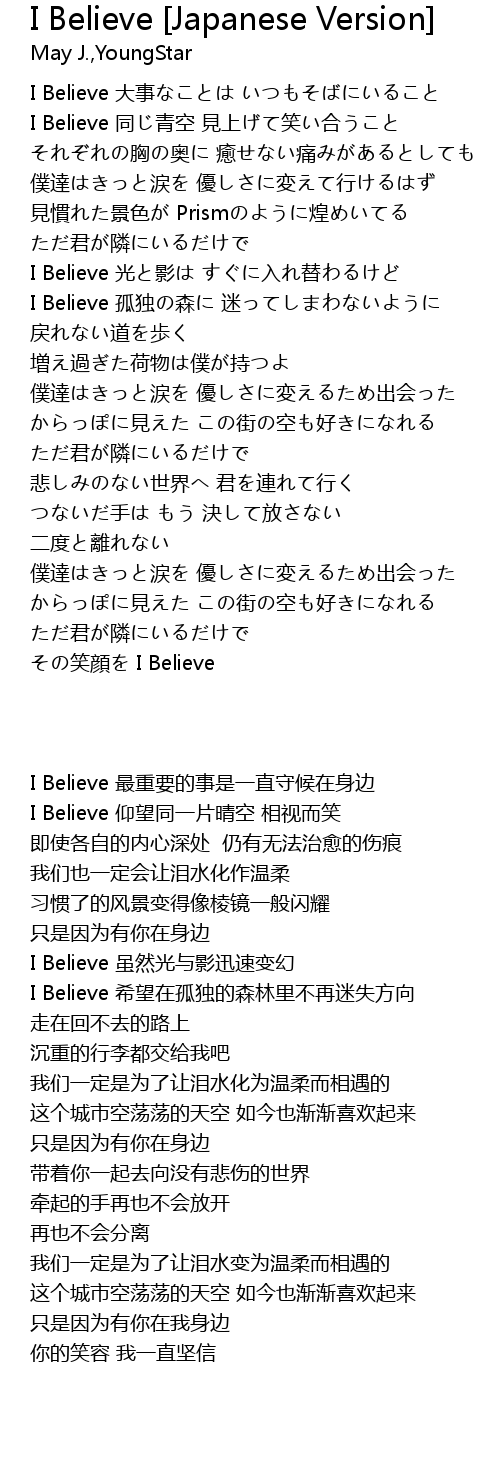 | [00:15.800] | I Believe 大事なことは いつもそばにいること |