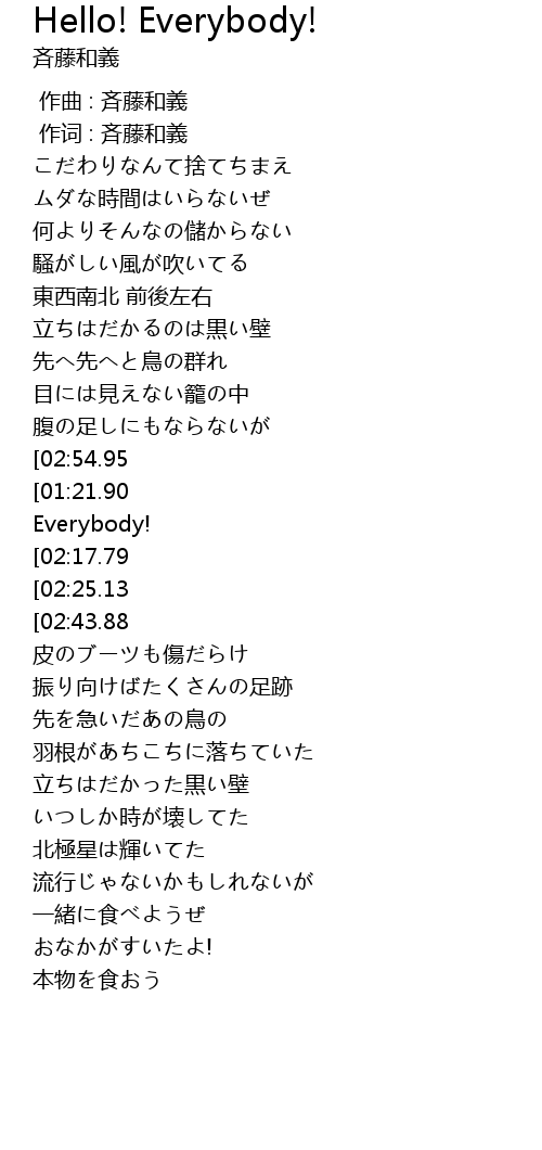 | [01:14.28][01:21.90][02:13.85][02:21.30][02:58.44][03:05.90][03:13.34][03:20.77][03:28.42][03:35.59][03:43.04][03:46.73][03:50.42][03:54.19] | Hello! Everybody! |