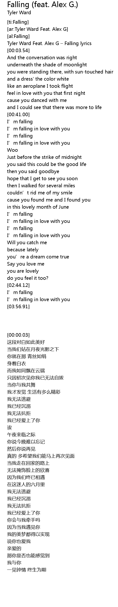 | [00:00.03] | Tyler Ward Feat. Alex G – Falling lyrics |