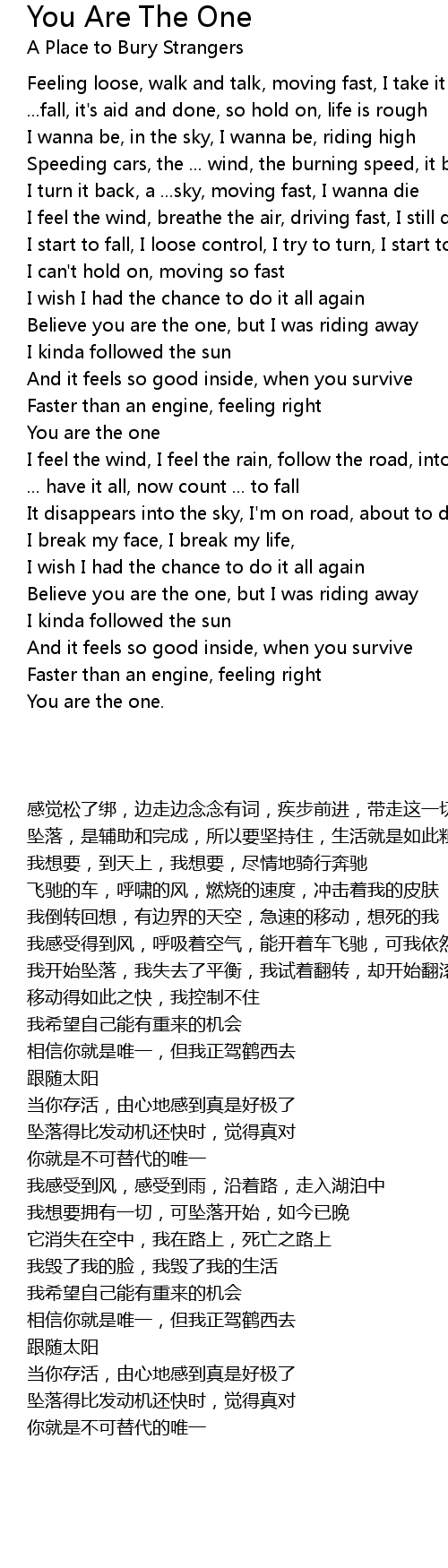 Speeding cars, the ... wind, the burning speed, it breaks my skin |