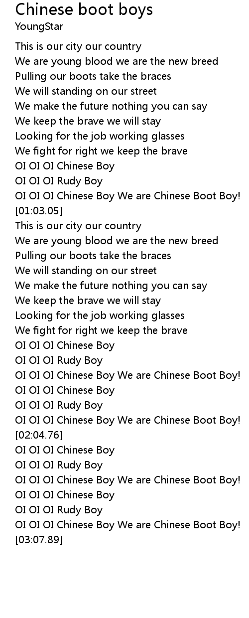 | [01:58.18] | OI OI OI Chinese Boy We are Chinese Boot Boy! |