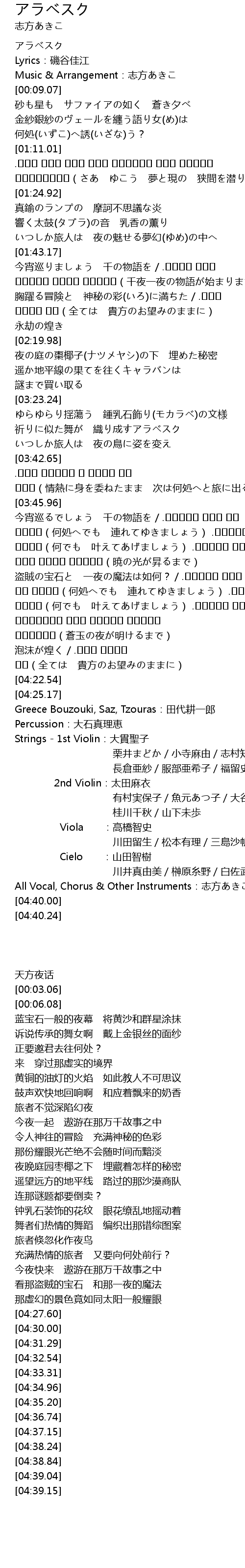 | [03:45.97] | 今宵巡るでしょう 千の物語を / .سأخذك إلى كل مكان(何処へでも 連れてゆきましょう) .سألبي طلبك(何でも 叶えてあげましょう) .سألبي طلبك قبل شروق الشمس(暁の光が昇るまで) |