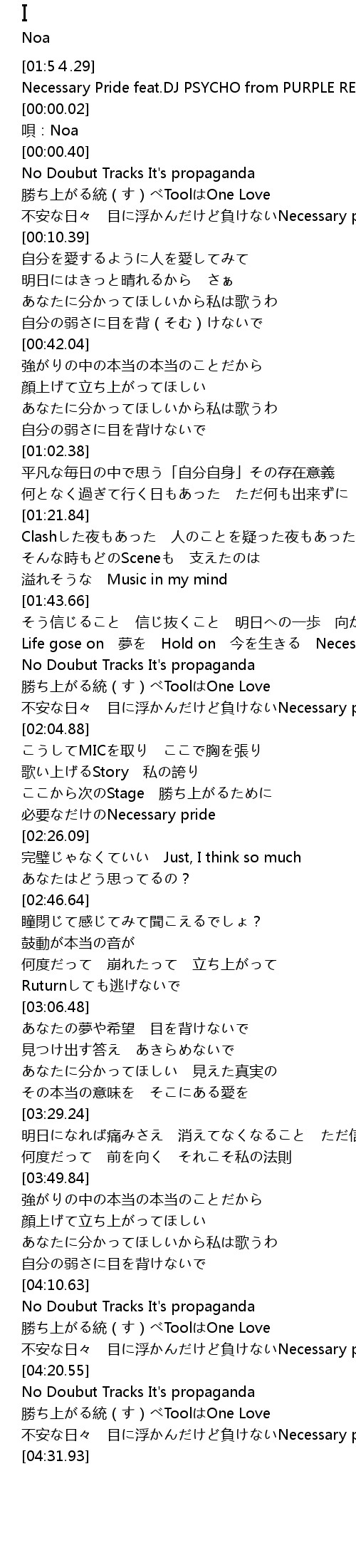 | [04:26.91] | 不安な日々 目に浮かんだけど負けないNecessary pride |