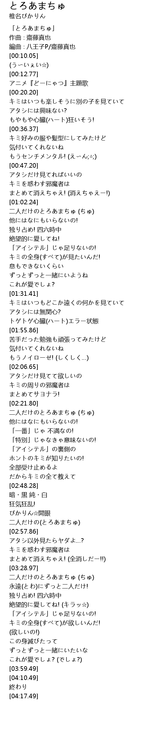 | [02:22.41] | 二人だけのとろあまちゅ (ちゅ) |