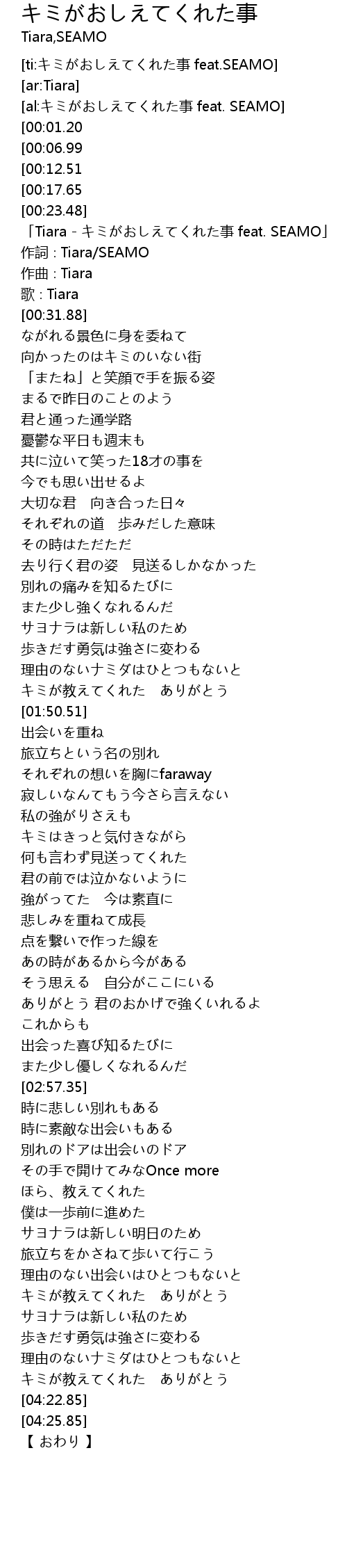 | [00:25.88] | 「Tiara - キミがおしえてくれた事 feat. SEAMO」 |