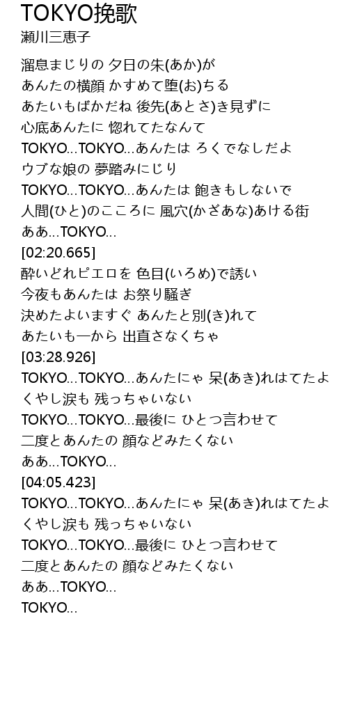 | [04:07.424] | TOKYO…TOKYO…あんたにゃ 呆(あき)れはてたよ |