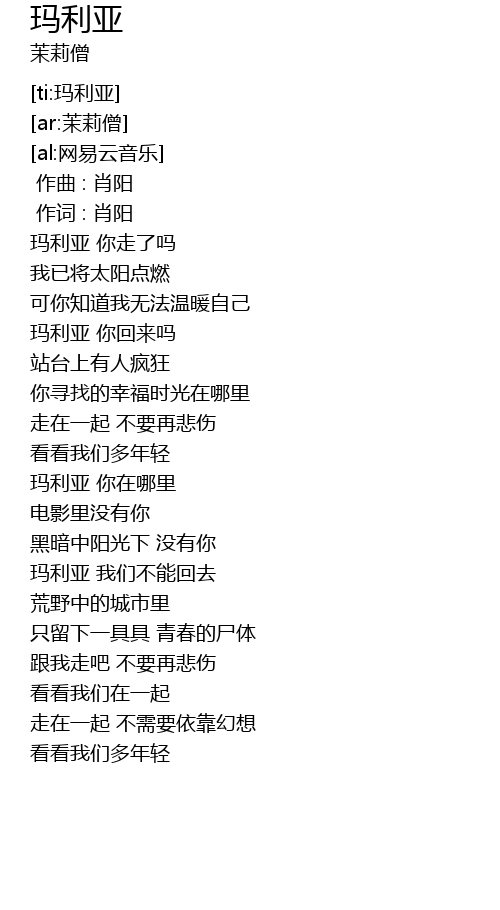 | [00:14.29] | mǎ lì yà nǐ zǒu le ma |