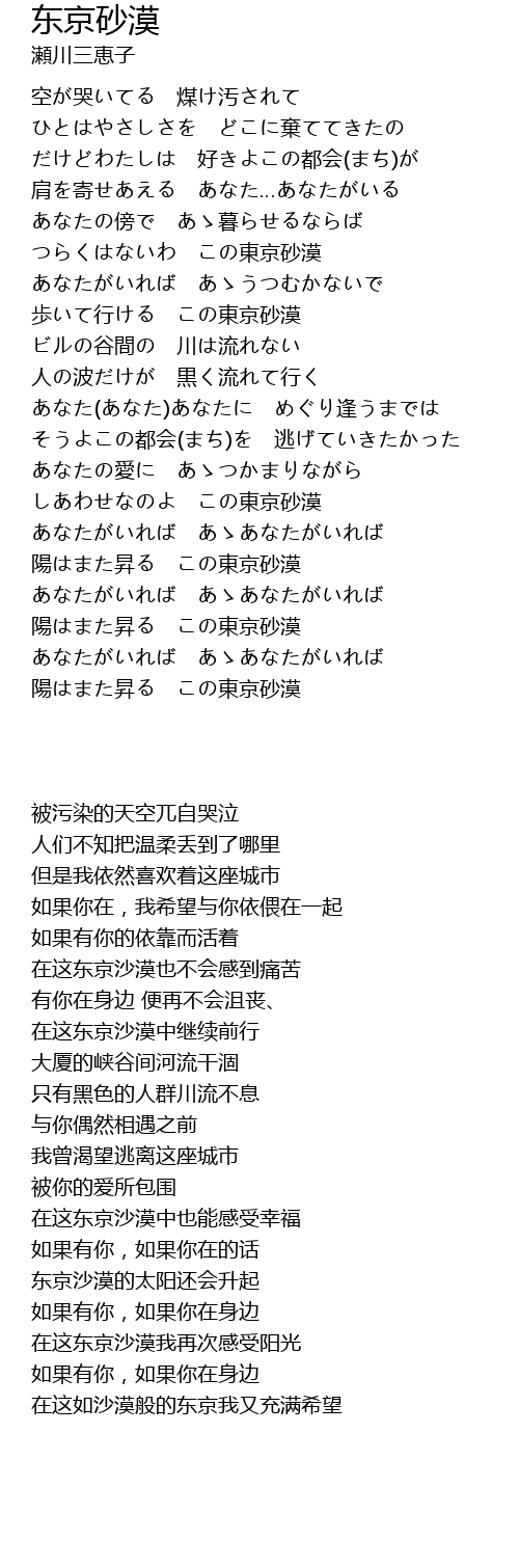 | [01:33.22] | 歩いて行ける この東京砂漠 |