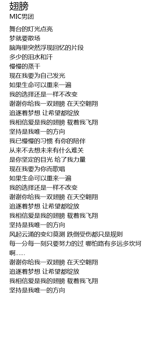 | [01:09.000] | 我相信爱是我的翅膀 载着我飞翔 坚持是我唯一的方向 |