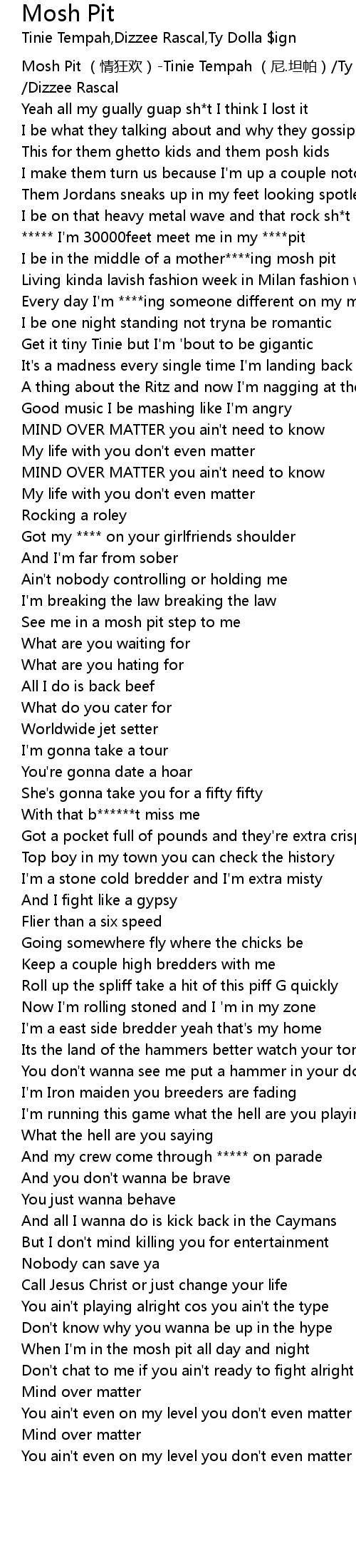 | [00:00.00] | Mosh Pit qíng kuáng huān Tinie Tempah ní. tǎn pà Ty Dolla ign Dizzee Rascal |