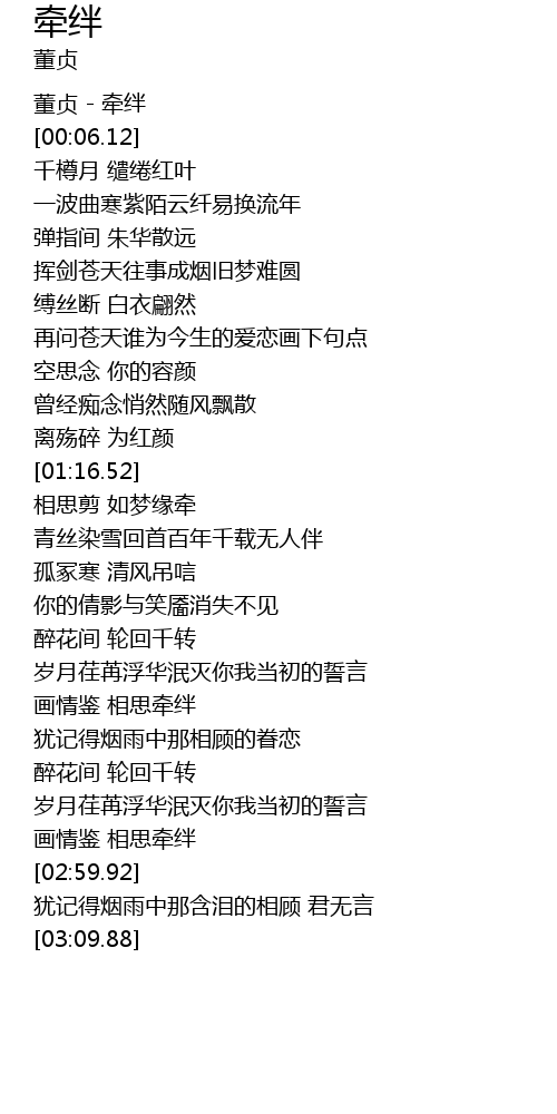 | [00:03.12] | 董贞 - 牵绊 |