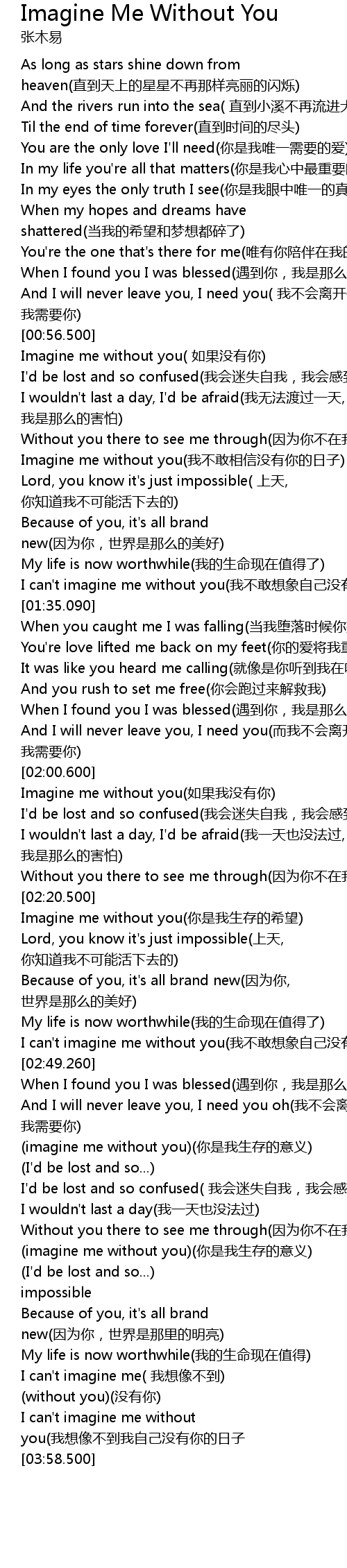 | [02:06.100] | Imagine me without you rú guǒ wǒ méi yǒu nǐ |