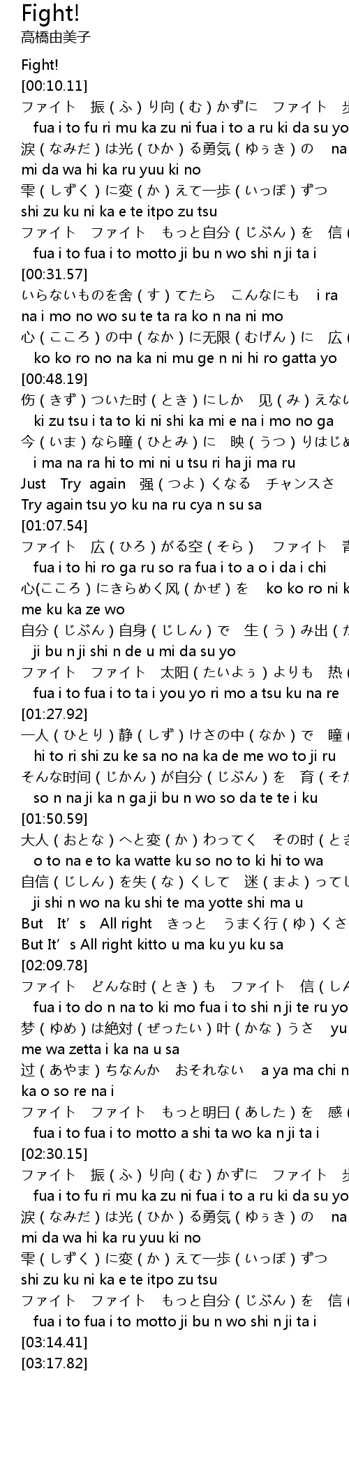 | [01:10.43] | ファイト 広(ひろ)がる空(そら) ファイト 青(あお)い大地(だいち) fua i to hi ro ga ru so ra fua i to a o i da i chi |