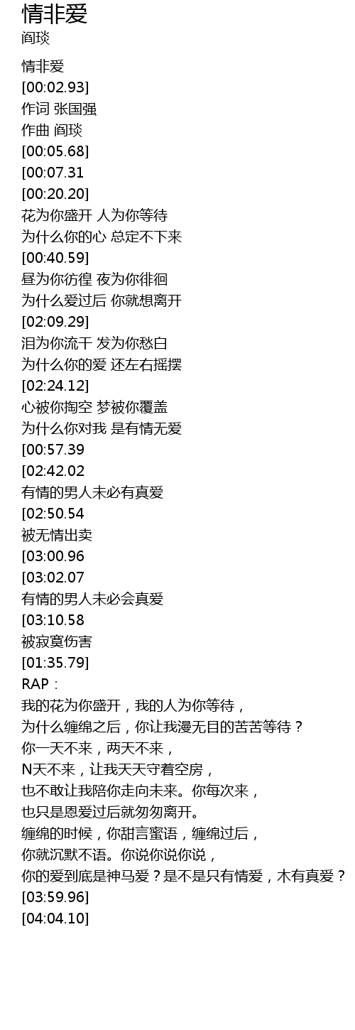 | [03:42.03][03:02.07][01:18.43] | 情非爱啊情非爱 有情的男人未必会真爱 |