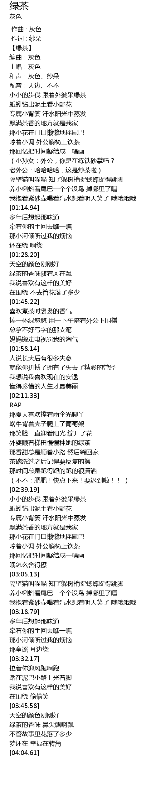 | [01:32.11] | 绿茶的香味随着风在飘 |