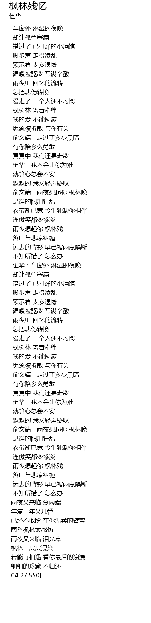 | [03:26.500] | 雨夜想起你 枫林残 |