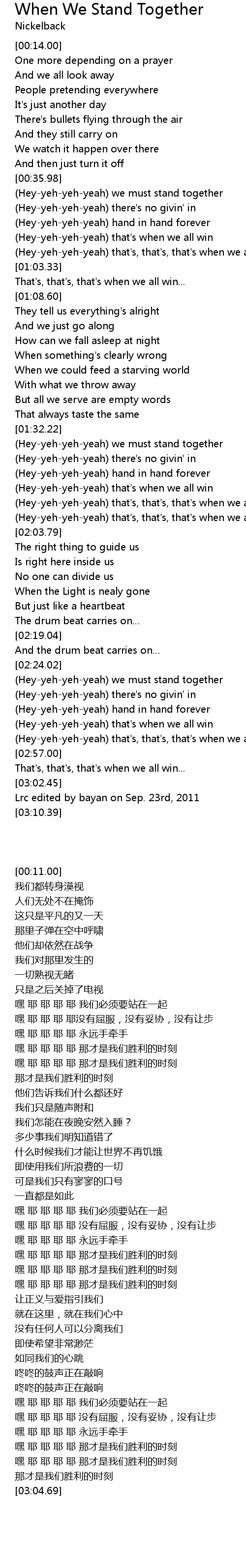 | [01:32.72] | Heyyehyehyeah we must stand together |