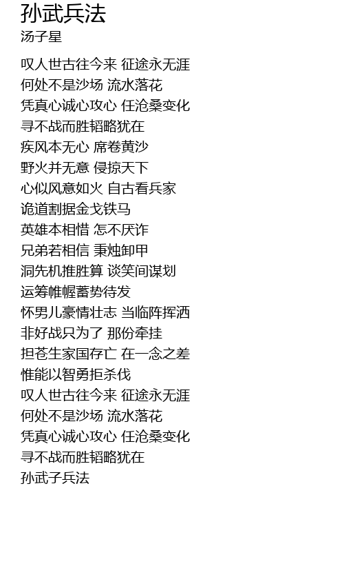 | [00:55.20] | xīn shì fēng yì rú huǒ zì gǔ kàn bīng jiā |