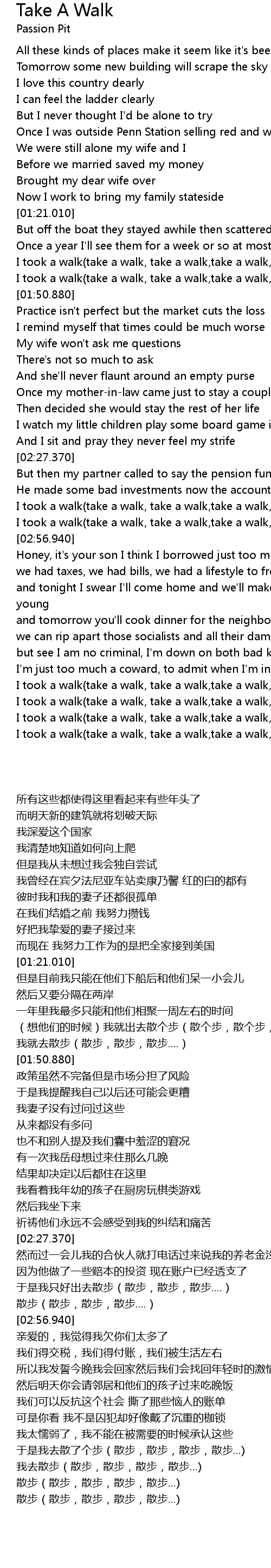| [01:41.210] | I took a walk(take a walk, take a walk,take a walk,take a walk...) |