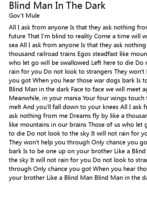 All I ask from anyone Is that they ask nothing from me Stared so long at the future That I'm blind to reality Come a time will watch our lives Slip into the sea All I ask from anyone Is that they ask nothing from me Dreams fly by like a thousand railroad trains Egos steadfast like mountains in our brains Those of us who let go will be swallowed Left here to die Do not look to the sky It will not rain for you Do not look to strangers They won't help you through Only chance you got When you hear those war dogs bark Is to be one up on your brother Like a Blind Man in the dark Face to face we will meet again But never eye to eye Meanwhile, in your mania Your four wings touch the sky Fly too high the wax will melt And you'll fall down to your knees All I ask from you my friend Is that you ask nothing from me Dreams fly by like a thousand railroad trains Egos steadfast like mountains in our brains Those of us who let go will be swallowed Left here to die Do not look to the sky It will not rain for you Do not look to strangers They won't help you through Only chance you got When you hear those war dogs bark Is to be one up on your brother Like a Blind Man in the dark Do not look to the sky It will not rain for you Do not look to strangers They won't help you through Only chance you got When you hear those war dogs bark Is to be one up on your brother Like a Blind Man Blind Man in the dark Blind Man in the dark |