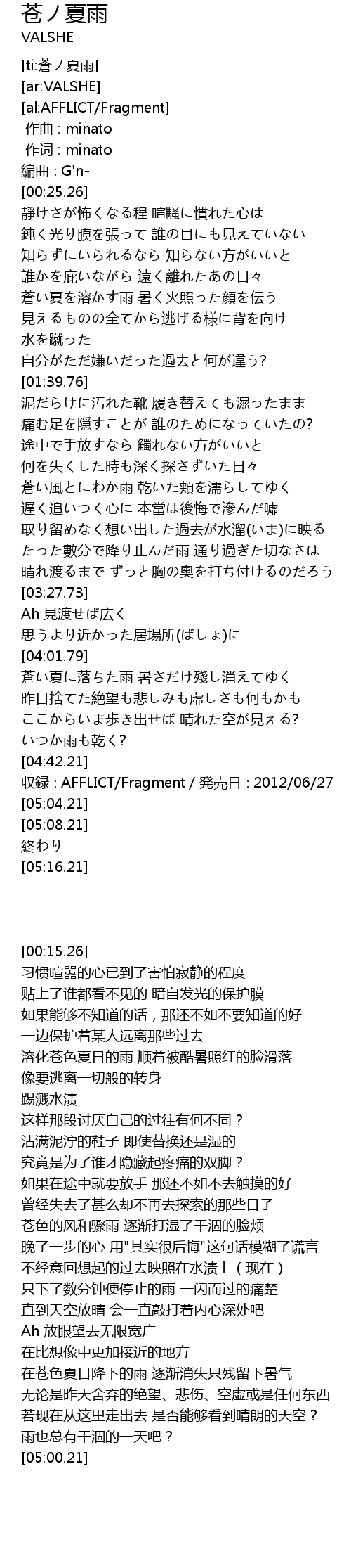 | [05:00.21] | shōu lù AFFLICT Fragment fā mài rì 2012 06 27 |