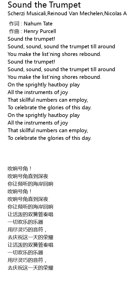 | [00:50.77] | Sound, sound, sound the trumpet till around |