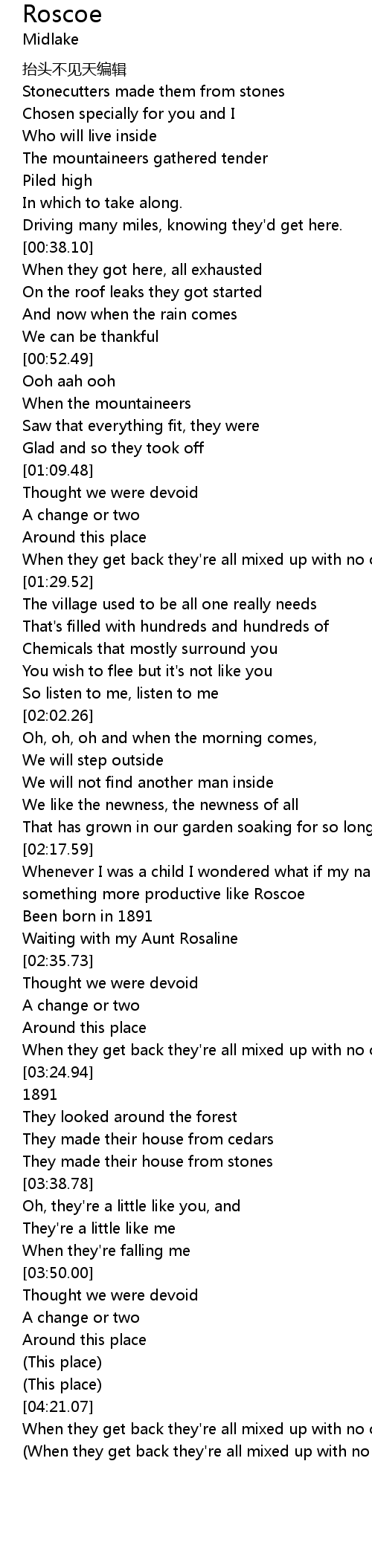 | [02:18.26] | Whenever I was a child I wondered what if my name had changed into something more productive like Roscoe |
