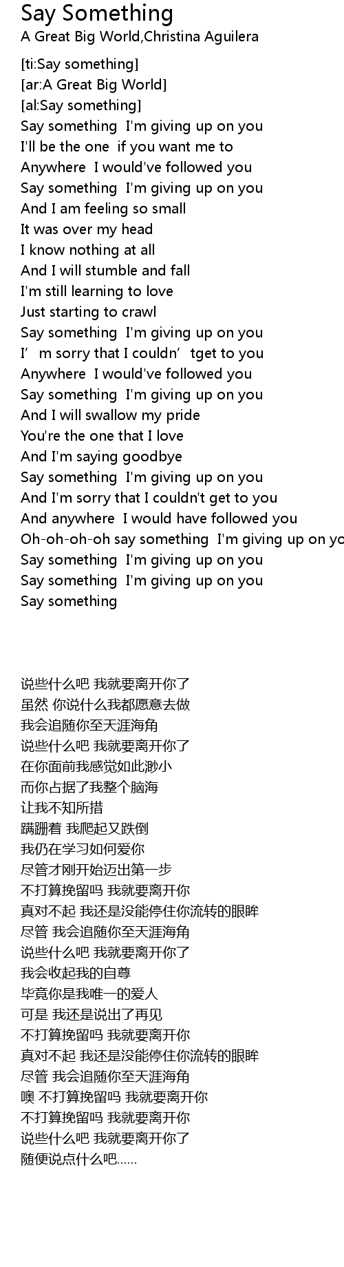 | [03:05.35] | Oh-oh-oh-oh say something I'm giving up on you |