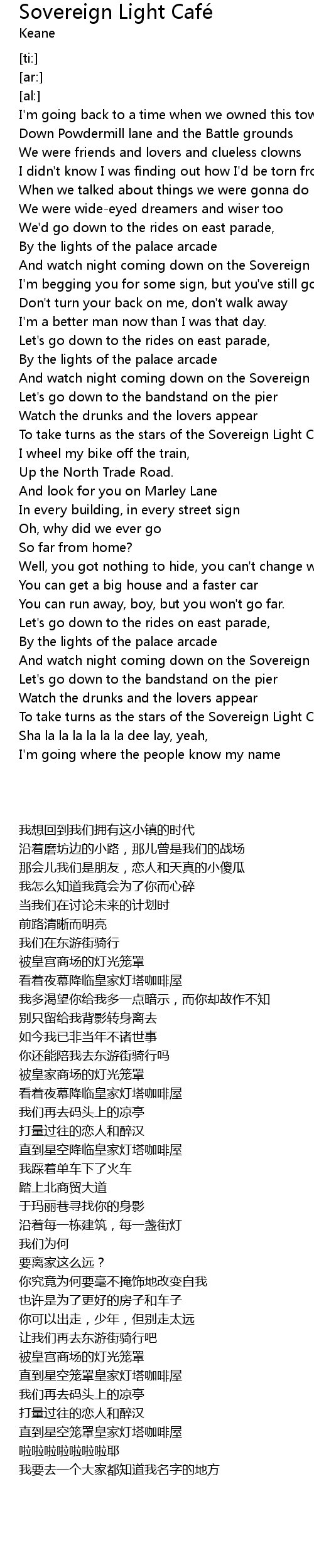 | [00:42.09] | And watch night coming down on the Sovereign Light Cafe |