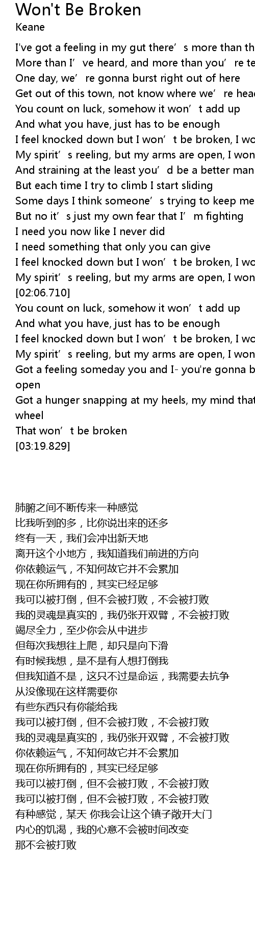 | [01:48.950] | I feel knocked down but I won' t be broken, I won' t be broken |
