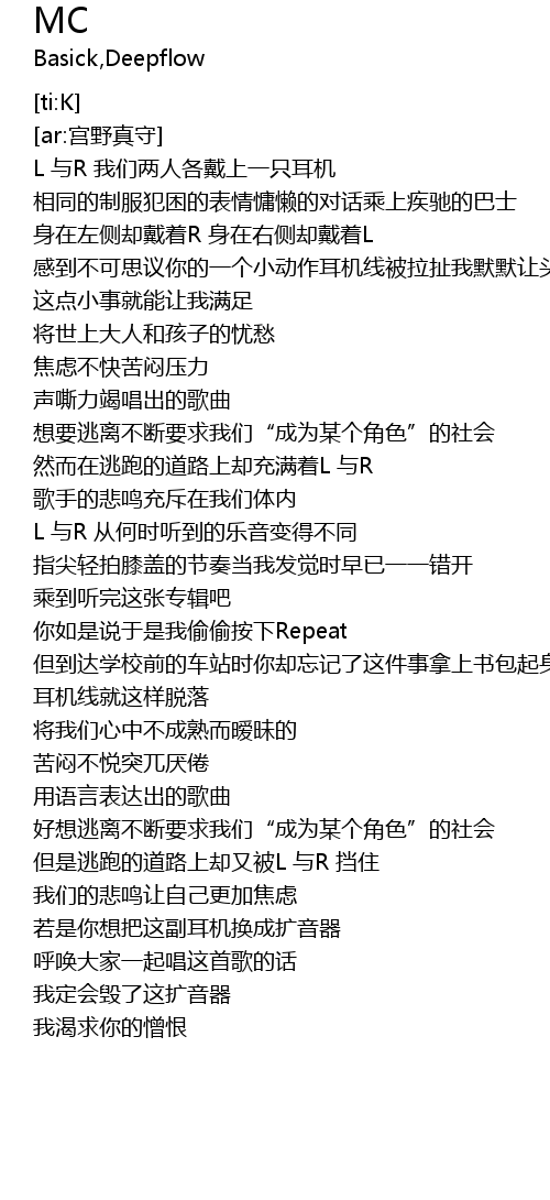| [00:04.77] | L 与R 我们两人各戴上一只耳机 |