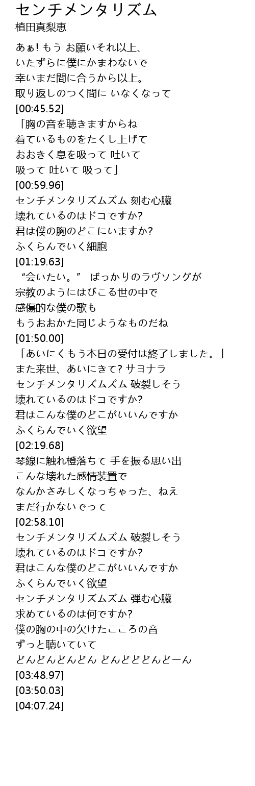 | [03:00.73] | センチメンタリズムズム 破裂しそう |