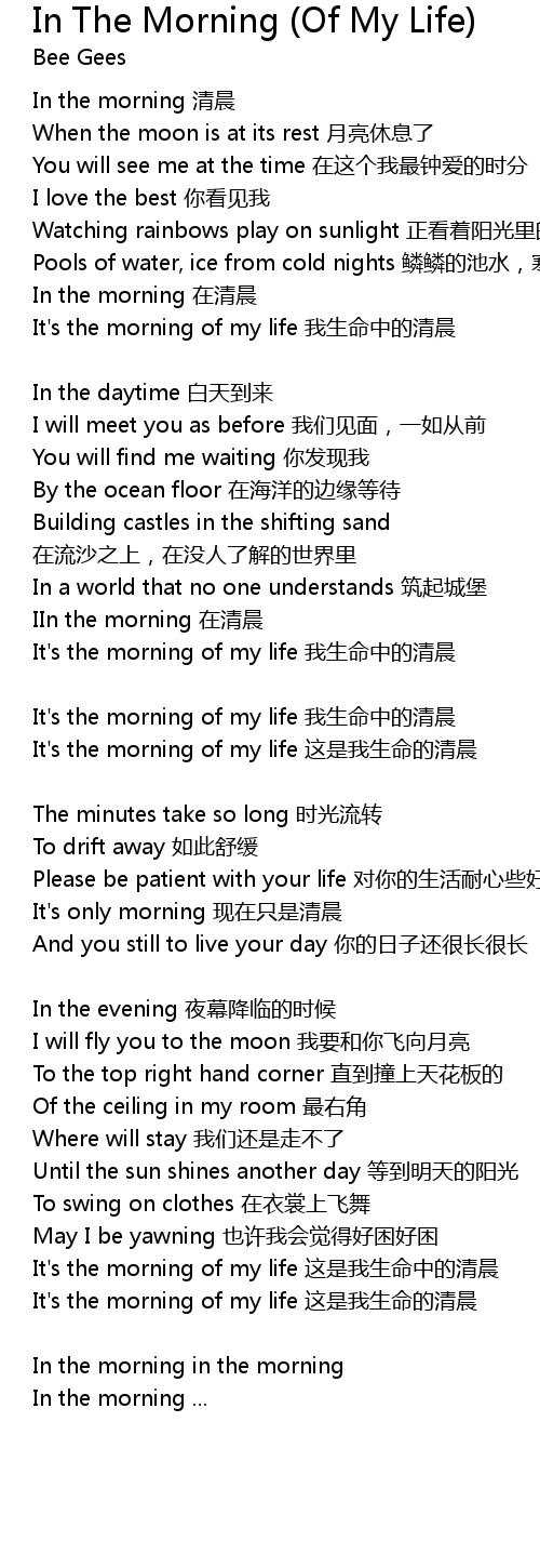 | It' s the morning of my life zhè shì wǒ shēng mìng zhòng de qīng chén | |