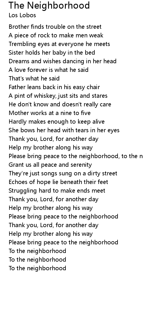 Please bring peace to the neighborhood, to the neighborhood |