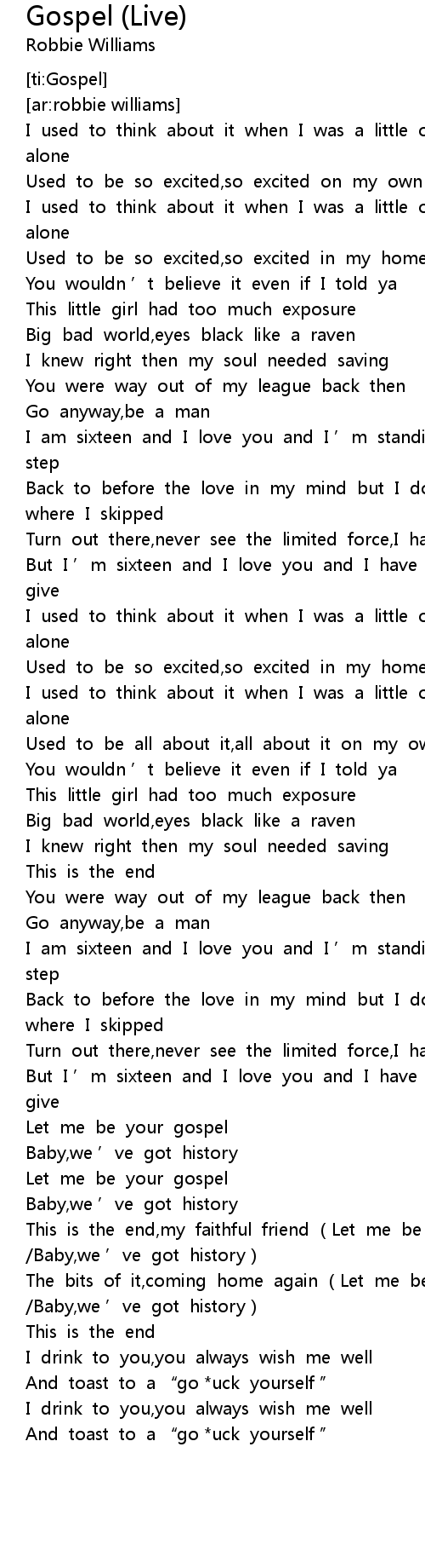 | [03:06.113] | The bits of it, coming home again Let me be your gospel Baby, we ' ve got history |