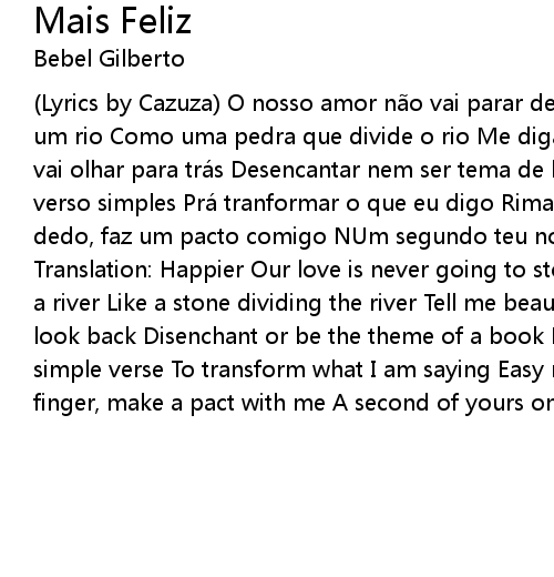 | (Lyrics by Cazuza) O nosso amor não vai parar de rolar De fugir e seguir como um rio Como uma pedra que divide o rio Me diga coisas bonitas O nosso amor não vai olhar para trás Desencantar nem ser tema de livro A vida inteira eu quiz um verso simples Prá tranformar o que eu digo Rimas fáceis, calafrios Fura o dedo, faz um pacto comigo NUm segundo teu no meu Por um segundo mais feliz Translation: Happier Our love is never going to stop Running away and flow like a river Like a stone dividing the river Tell me beautiful things Our love won't look back Disenchant or be the theme of a book My whole life I searched for a simple verse To transform what I am saying Easy rimes, goose bumps Pinch a finger, make a pact with me A second of yours on mine Happier for a second |